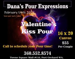 Our Valentine's Event for 2022. Looking for a fun activity for you and your Valentine, You will create with lasting memories. At Dana's Pour Expressions you will create a beautiful 16x20 "Kiss Pour" Flow Art Pour Expression Canvas. Reach out by PM on FB or by calling/texting the studio at (360)552 8574